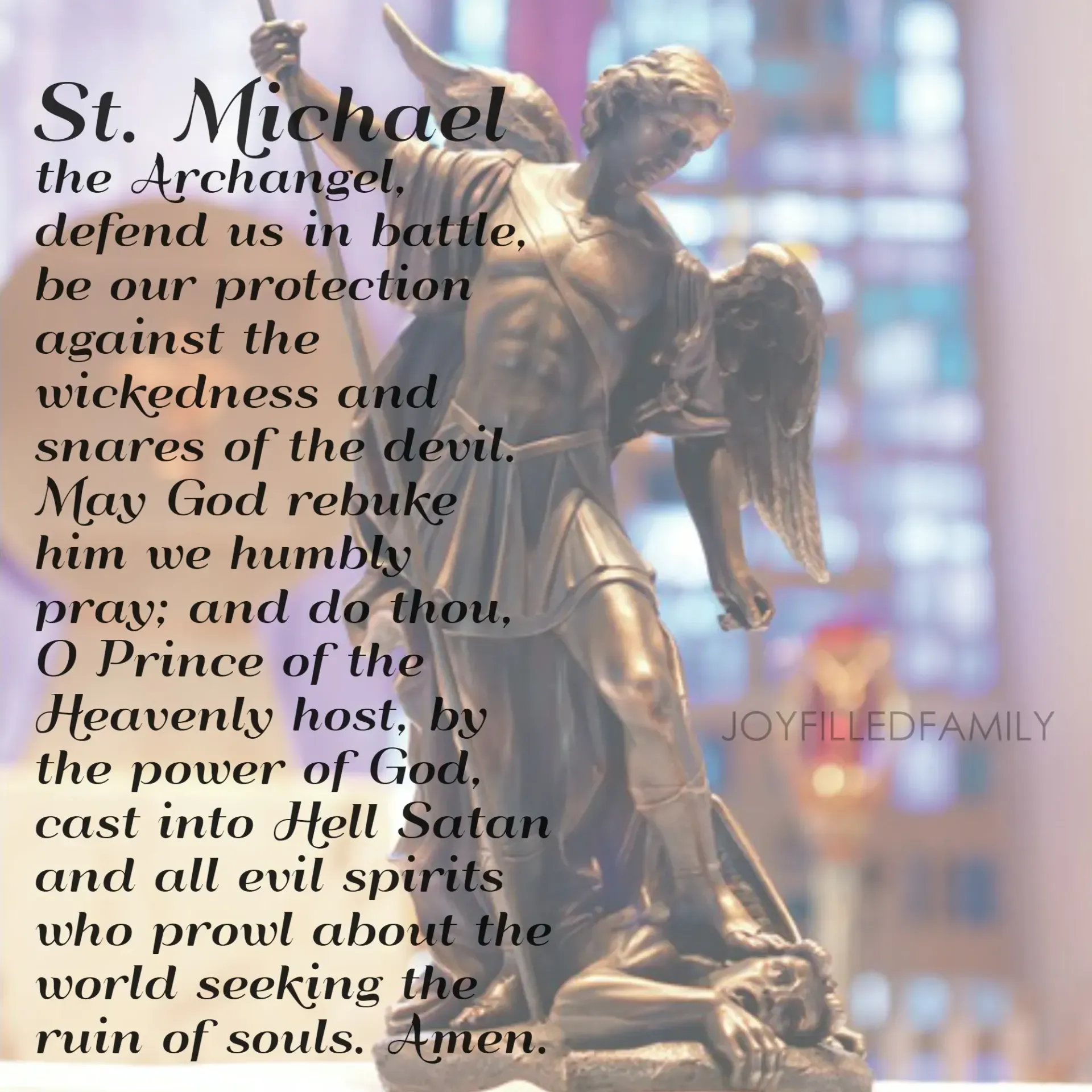 Defiéndenos en la batalla. Se nuestro amparo contra la perversidad y asechanzas del demonio. Reprímale Dios, pedimos suplicantes, y tu príncipe de la milicia celestial, arroja al infierno con el divino poder a satanás y a los otros espíritus Malignos que andan dispersos por el mundo para la perdición de las almas. Amen.